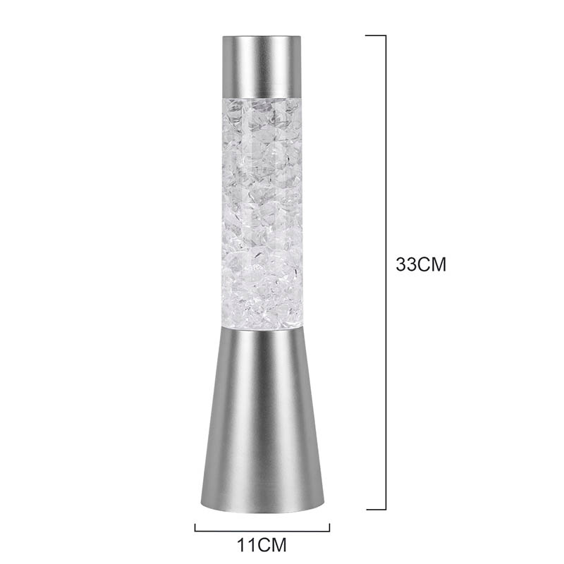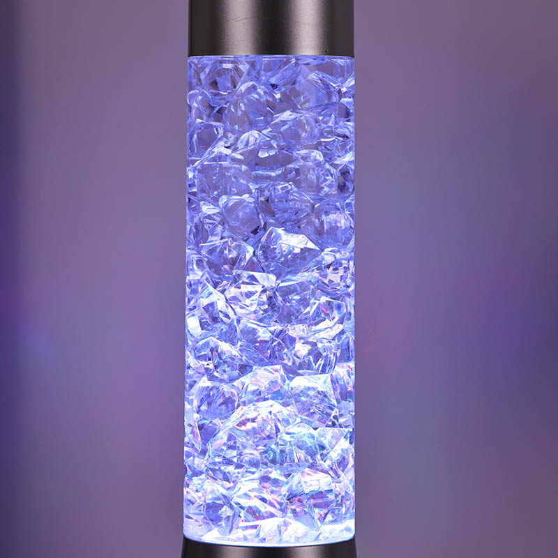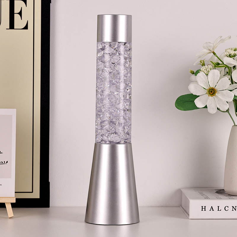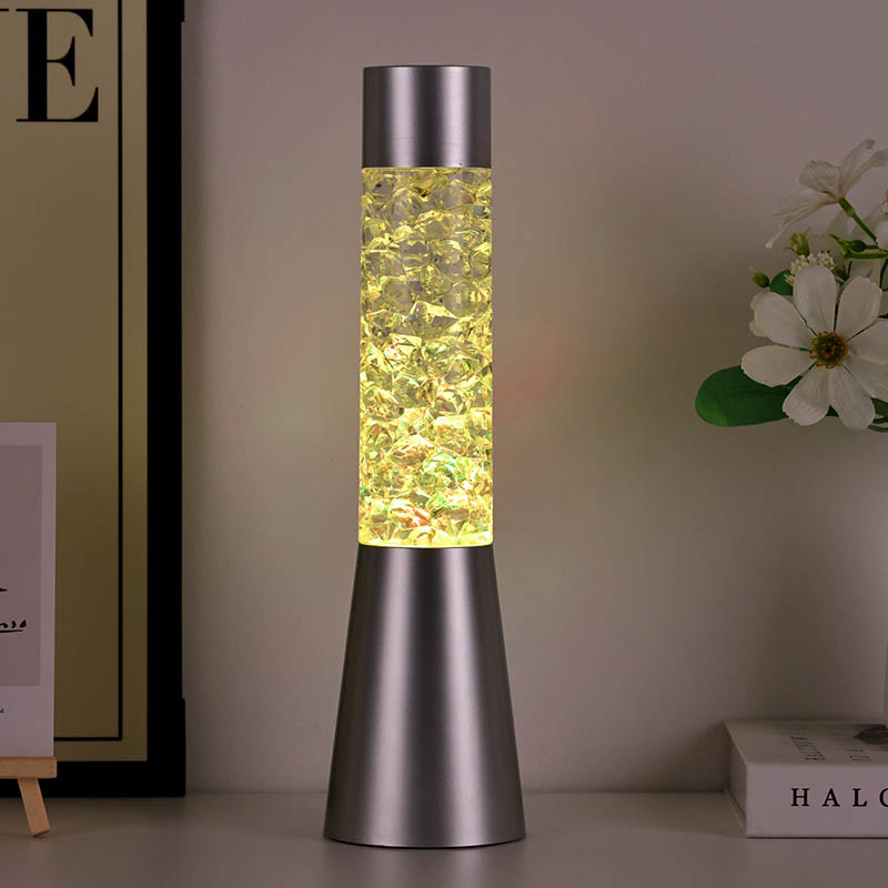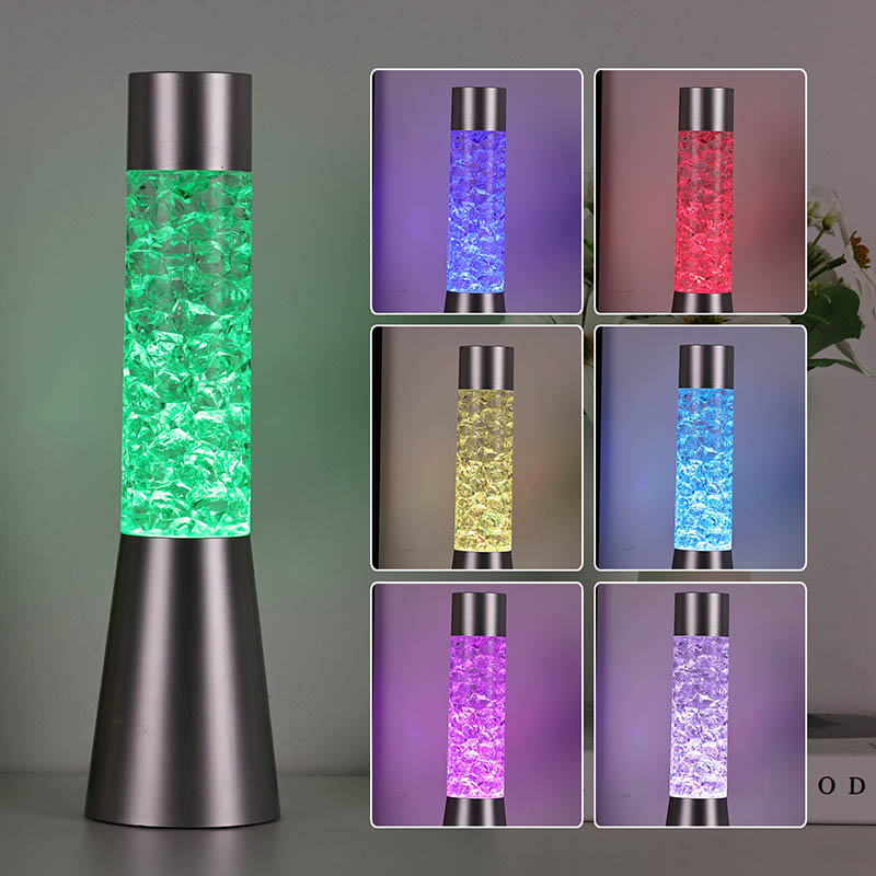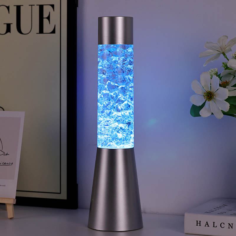 Diseinu dotorea eta modernoa du, kolorez aldatzeko distira likidoaren gaueko argiak, oinarri metaliko batekin eta kristal itxurako pieza koloretsuz betetako goiko atal garden batekin. Lanpararen oinarria egonkorra eta dotorea izateko diseinatuta dago, etxeko edozein dekorazio-estilo osatuz. Atal gardenak astiro mugitzen diren pieza koloretsuak biltzen ditu, ikusmen efektu liluragarria sortuz. Lanpara hiru kolore ezberdinetan dago eskuragarri: gorria, urdina eta berdea, zure barruko dekorazioarekin bat datorren tonu ezin hobea aukeratzeko.