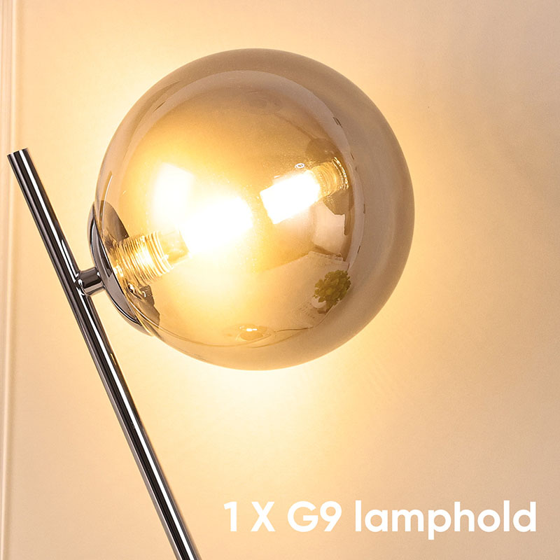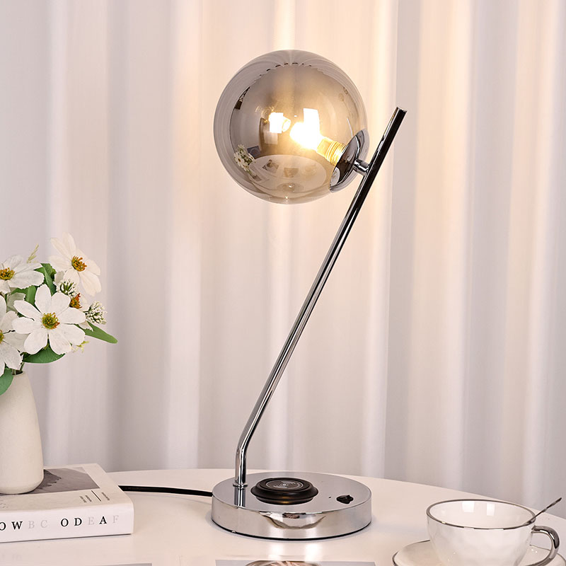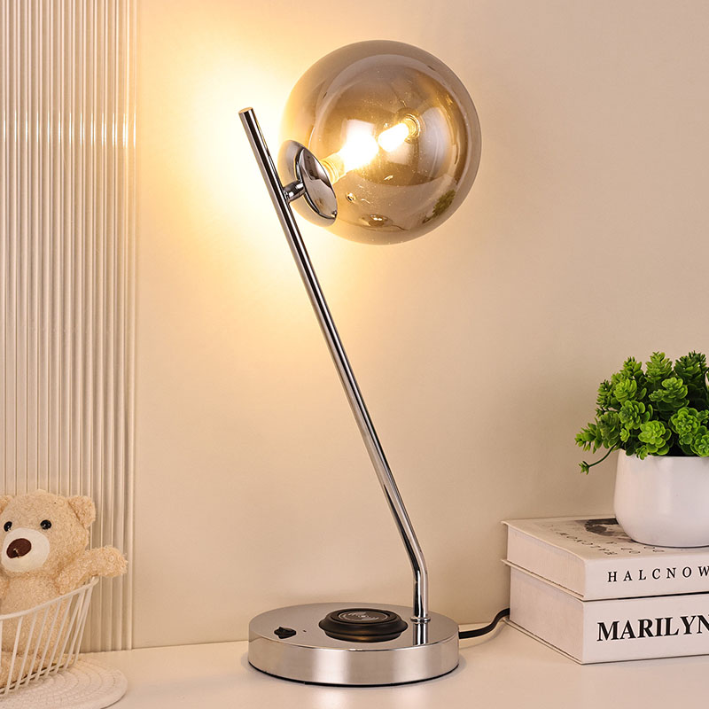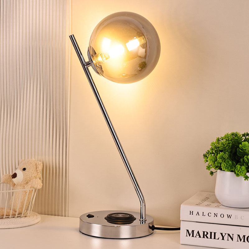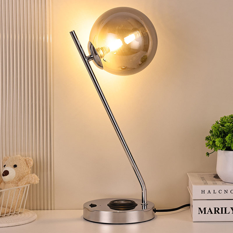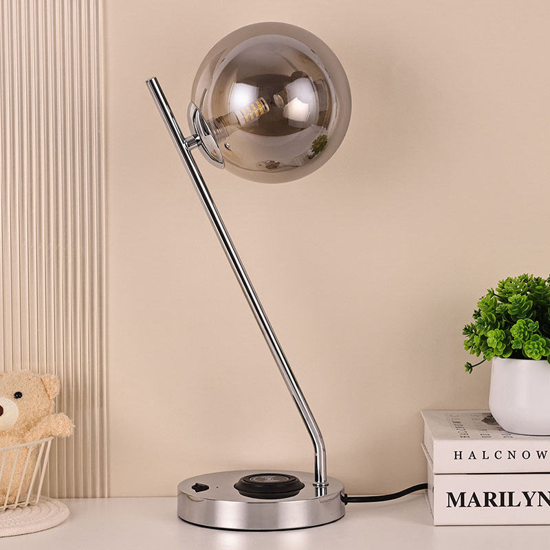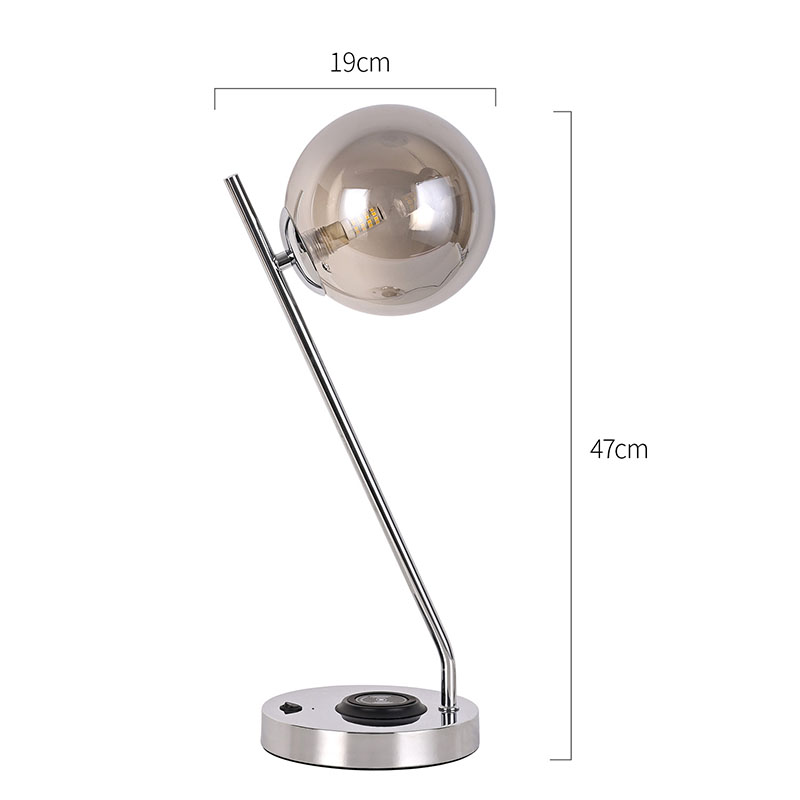 Haririk gabeko kargagailudun beirazko bola iluneko mahaiko lanpara metalezko oinarrian eta beiraz egina dago。Beirazko estalkiak lanparari ehundura gardena eta purua emateaz gain, argia modu eraginkorrean zabaltzen du, argia leunagoa eta uniformeagoa bihurtuz. Metalezko oinarria fin-fin leundu eta tratatu da, gainazal leun eta delikatua, ukitzeko erosoa, eta giro noble eta dotorea dario. Logelan, egongelan edo estudioan jarrita, mahaiko lanpara hau ezin hobeto uztartu daiteke inguruko ingurunearekin, giro moderno eta artistikoa gehituz.
