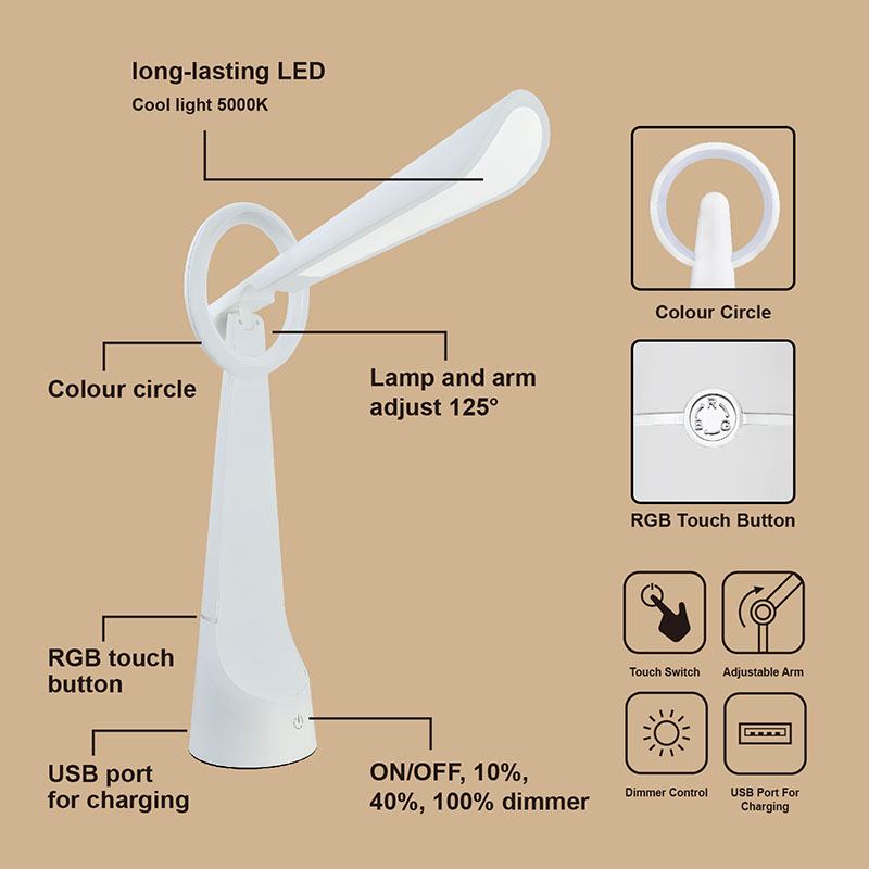 Dekorazioa rgb led mahaiko lanpararen argia produktuaren gorputzean 3 dimmer daiteke. Led argiaren burua 125 ° gehienez ireki daiteke.