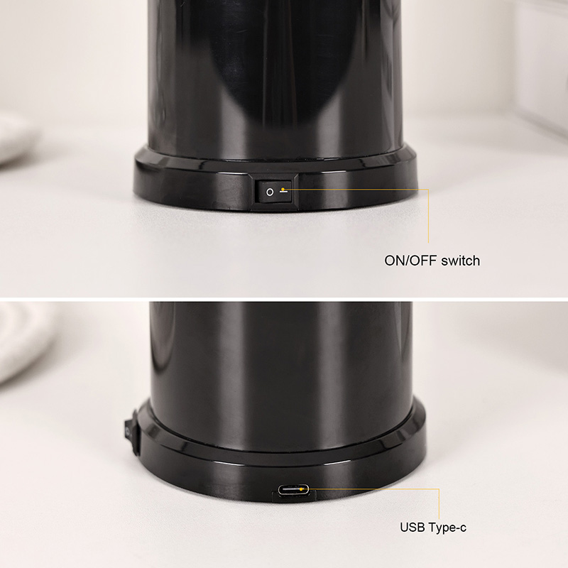 Oinarri eta estalki beltz distiratsu batekin egina, lanparak estetika minimalista baina sofistikatua du, barruko edozein dekorazioa osatzen duena. Gau-mahaian, mahaian, apaletan edo egongelako azentu batean jarrita, bere silueta finduak dotoretasun ukitu bat ematen dio, barruko eszena liluragarriari arreta erakartzen dion bitartean. Alboko botoi-etengailu soil batek funtzionamendu erraza ahalbidetzen du: argia pizteko edo itzaltzeko sakatu besterik ez dago, edo modu koloretsuetatik erraz pasatu.