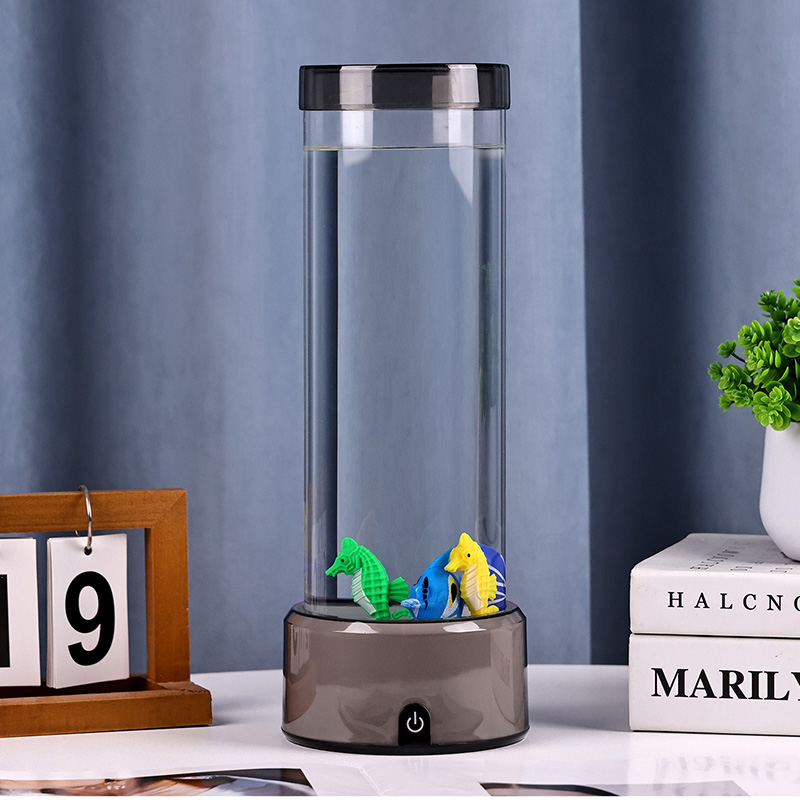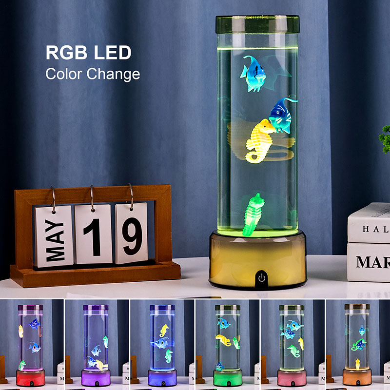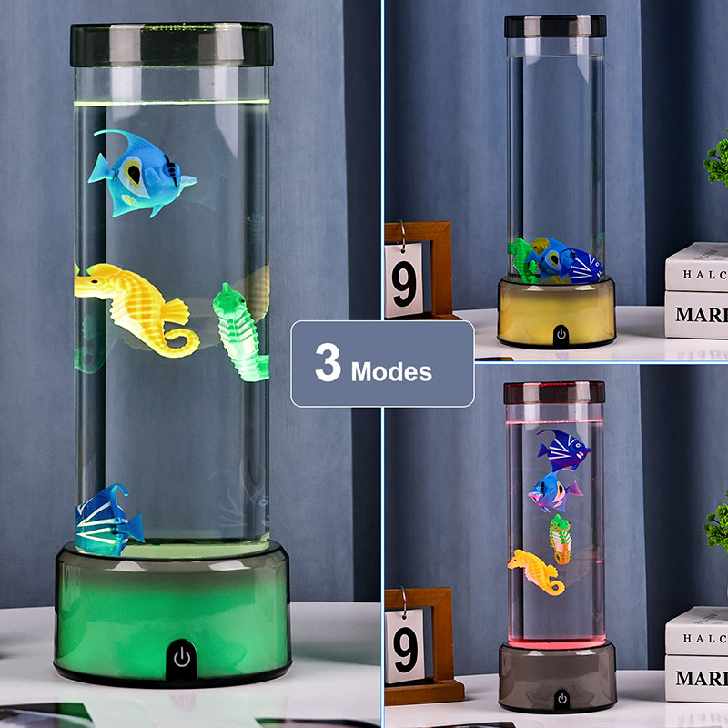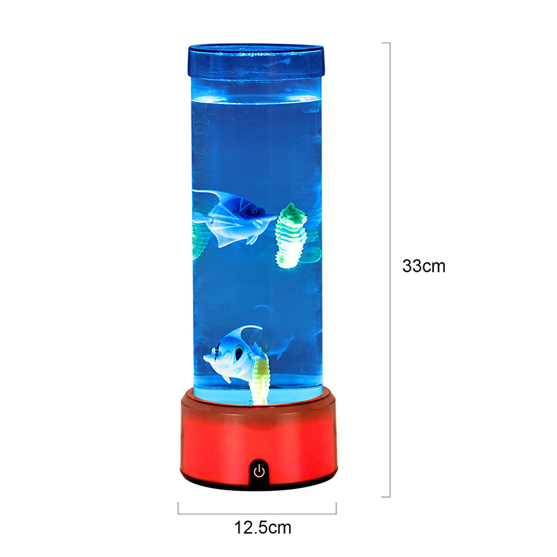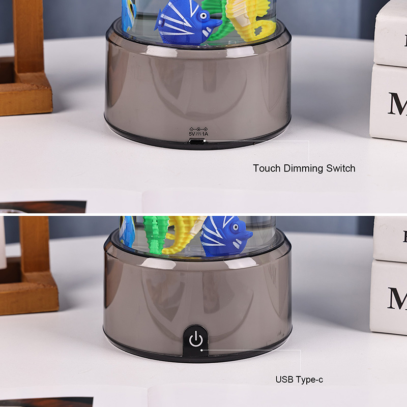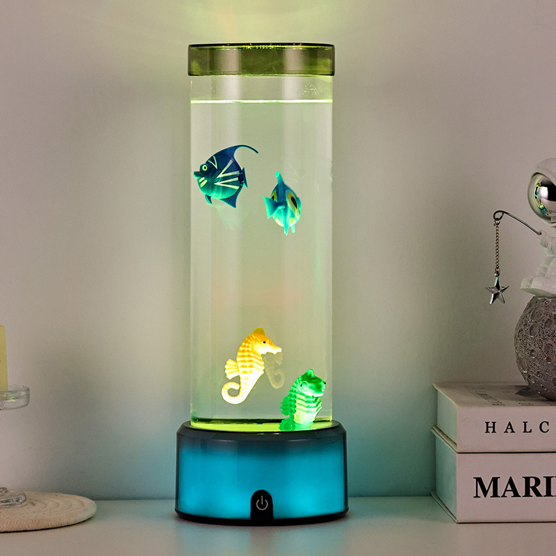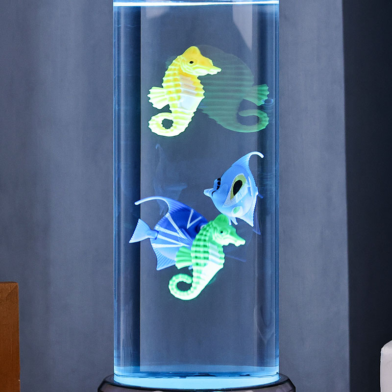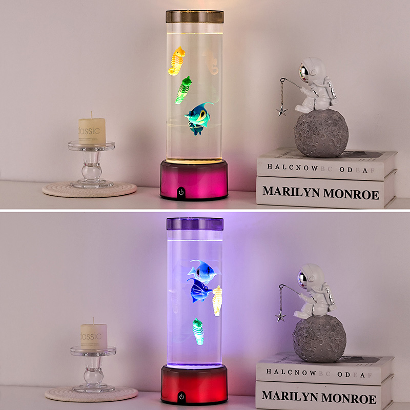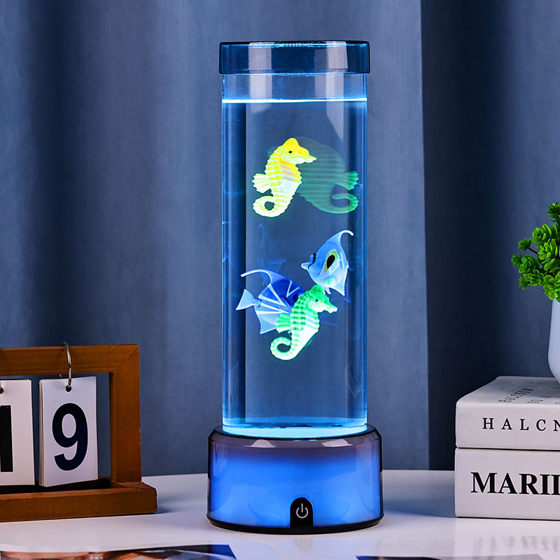 xarma. Kalitate handiko plastiko iraunkorrez egina, lanpara liluragarri honek likido argiz eta arrain-irudi ederrez betetako gorputz zilindriko dotorea du (arrain tropikal biziak eta itsas zaldi xarmangarri bat barne), ozeano-eszena lasai eta erreal bat sortuz, edozein geletara lasaitasuna eta gozamen bisuala ekartzen duena.