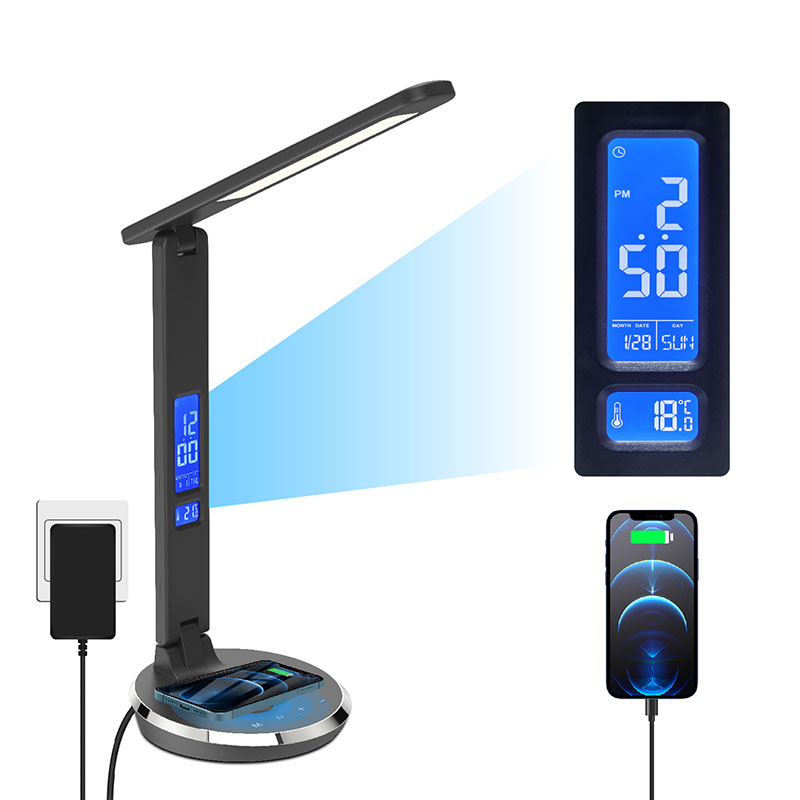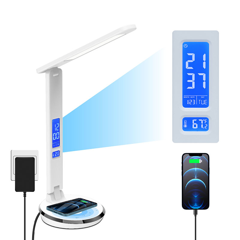 LCD pantaila du Tenperatura bistaratzearekin, Ordua, iratzargailua, atzeko gorputzaren kontrolatzeko botoia duen betiko egutegia. Eta mahaiko lanpararen itzalean usb karga-portua dago.