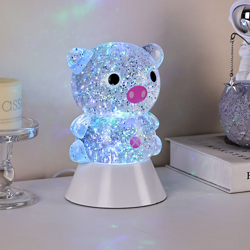 Diseinu orokorrak txerri-irudi polit eta maitagarri bat du, bere sestra biribil eta potoloekin begi handiekin, mutur arrosarekin eta belarri txiki maitagarriekin uztartuta, helduen zein haurren bihotzak berehala harrapatzen dituena. Erretxina gardena koloretako lentejuela distiratsuz eta likido bereziz beteta dago, argiak pizten direnean likidoarekin astiro-astiro isurtzen dena, txerriaren gorputzean isurtzen den ibai izartsu bat bezalako efektu bisual ameslaria sortuz. Kolore argiak automatikoki igarotzen dira, arrosa leunetik eta ametsezko moretik urdin eta berde freskoetara pasatzen dira, etengabe giro baketsu baina magikoa sortzen duten koloreen ortzadarra bihurtuz, maitagarrien mundua errealitatera ekarriko balu bezala.