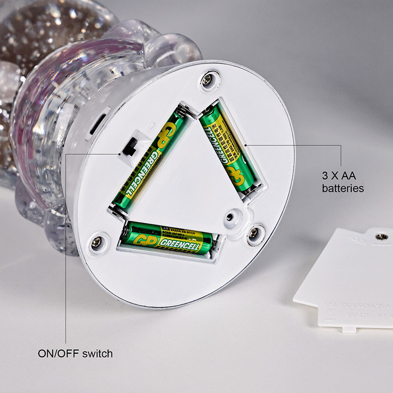 Txerri itzala RGB distirazko mahai-lanpara behealdean oinarri zuri sinple eta dotorea du, estetika orokorra hobetzen ez ezik, egonkortasuna ere hobetzen du iraultzerik ez izateko. Oinarriak bateriaren barne-konpartimentu bat dauka, non erabiltzaileek hiru AAA bateria erraz instala ditzaketen (ez dago barne). Entxufatu beharrik gabe, eramangarritasuna eskaintzen du eta ezin hobea da ohe, mahai, sehaska edo bidaian zehar jartzeko. Etengailuaren diseinua erabilerraza da, ukitu soil batekin pizteko eta itzaltzeko kontrola errazteko aukera ematen du, funtzionatzeko segurua eta erraza da, batez ere haurrek modu independentean erabiltzeko egokia.