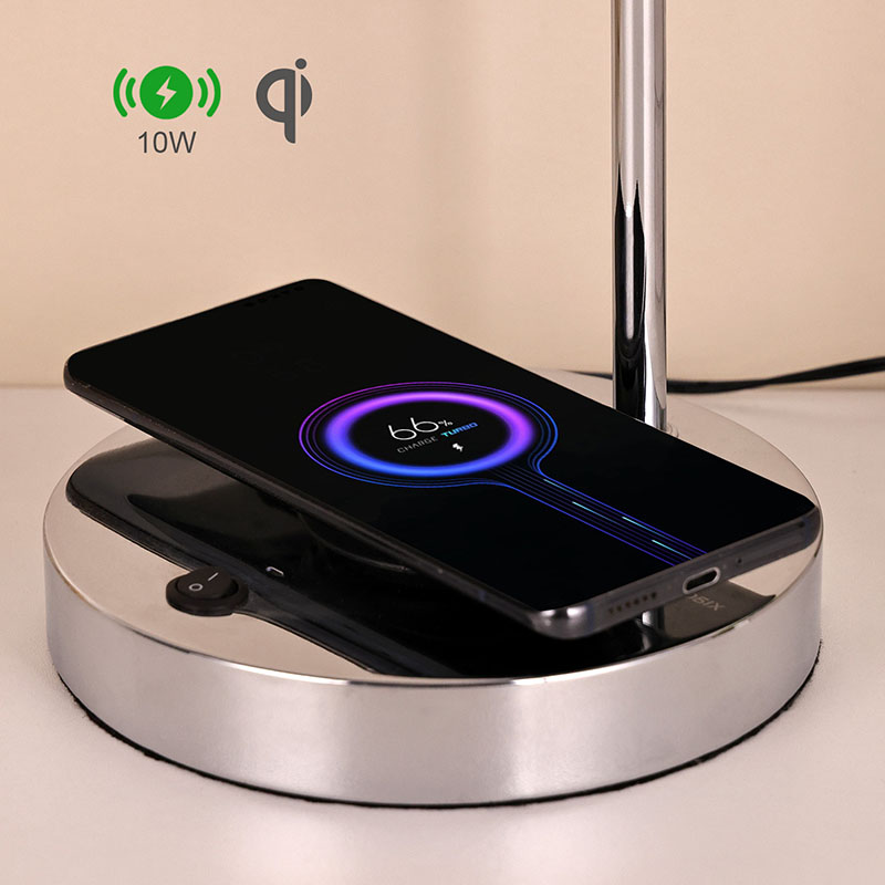 Zure erosotasunerako, beirazko pantaila duen QI led mahaiko lanpara haririk gabeko metalezko telefono mugikorra kargatzeko oinarri batekin ere hornituta dago. Jarri haririk gabeko kargatzeko gaituta duen telefonoa leunki oinarrian kargatzeko, konektatzeko eragiketa neketsurik egin gabe. Haririk gabeko kargatzeko teknologiak erabiltzeko erosotasuna hobetzeaz gain, kable nahasien arazoa saihesten du, mahaigaina txukun eta ederrago bihurtuz. Horrez gain, metalezko oinarriak beroa xahutzeko errendimendu ona du, kargatzeko prozesuaren segurtasuna eta fidagarritasuna bermatuz.