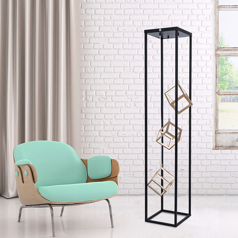 Diseinu modernoko solairuko lanparak, produktuaren ezaugarririk handiena metalez osatutako marko angeluzuzena da, barruan 3 LED argi-argi karraturekin. Diseinu orokorra aretoan dekorazio gisa erabil daiteke, eta goiko aldean botoi bat dago argiaren intentsitatea kontrolatzeko