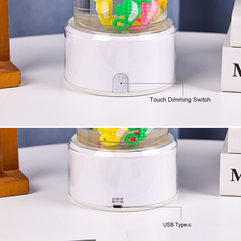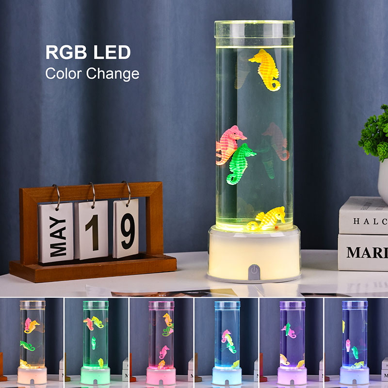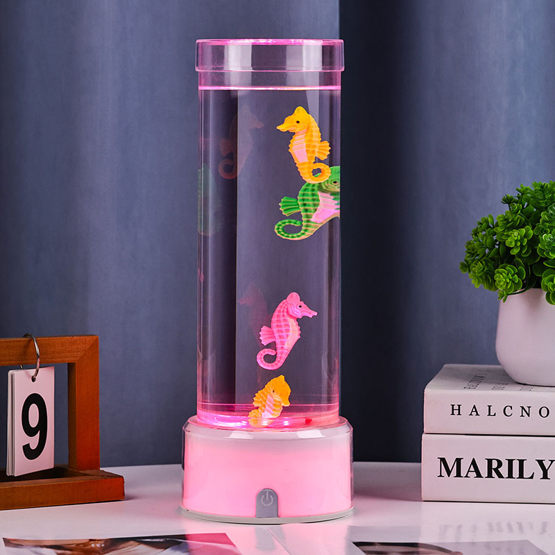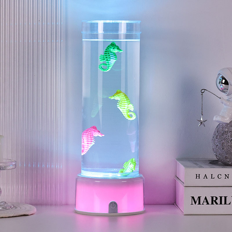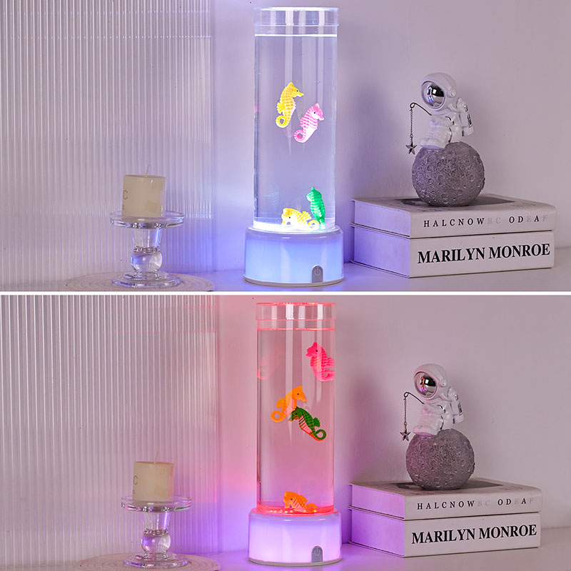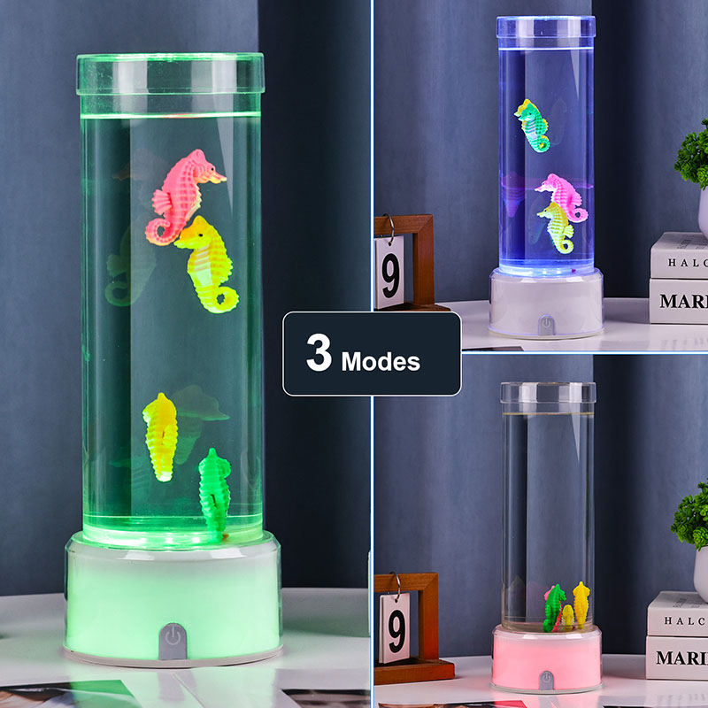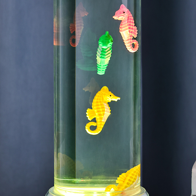 Ozeanoaren lasaitasuna eragiten duen urpeko eszena liluragarria Unitate osoa kalitate handiko plastiko iraunkorrez egina dago, segurtasun-egonkortasuna eta iraupen luzeko errendimendua bermatuz Lanparak gutxi gorabehera 12 hazbeteko altuera du fluido ez toxikoz eta itsas zaldi koloretsuz betetako hodi garden dotore batekin. Itsasoko bizitza errealaren antza duen kulunka-mugimendu naturala sortzen duen barne-zirkulazio-sistema Mugimendu leun hau lasaigarria da ikustea eta estresa murrizten laguntzen du, ikusmen-esperientzia lasaigarria eskaintzen duen bitartean
