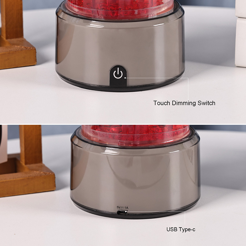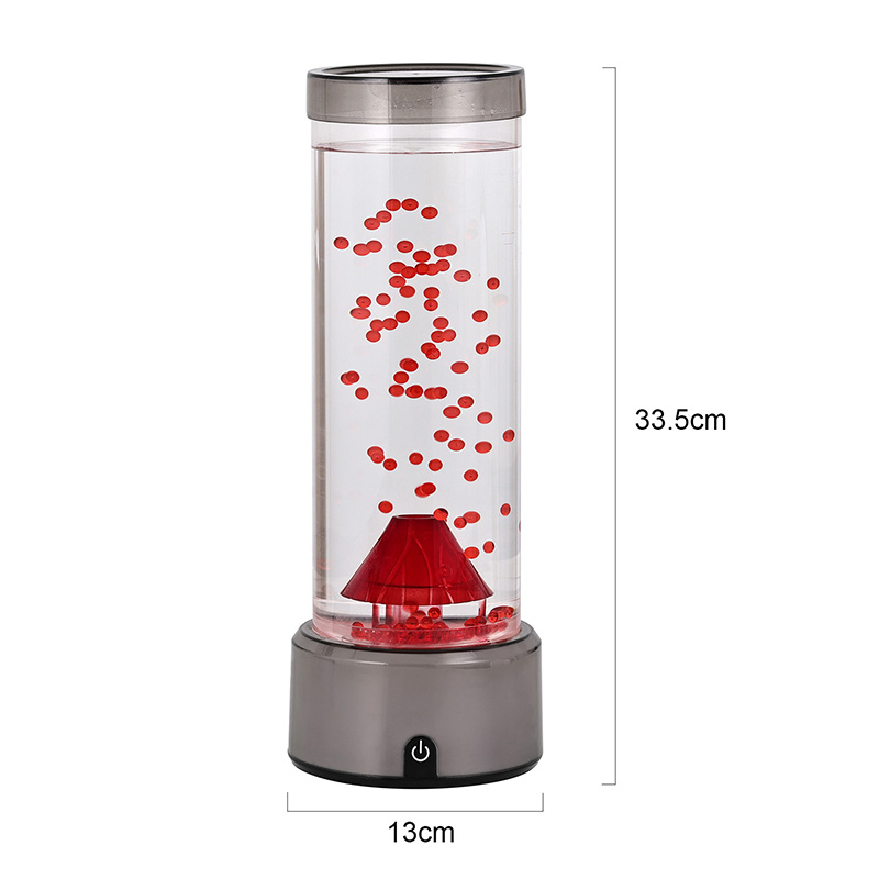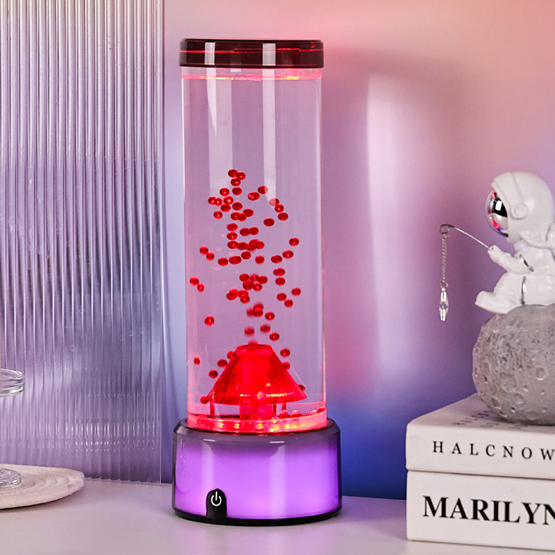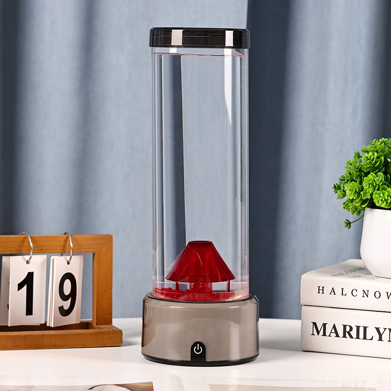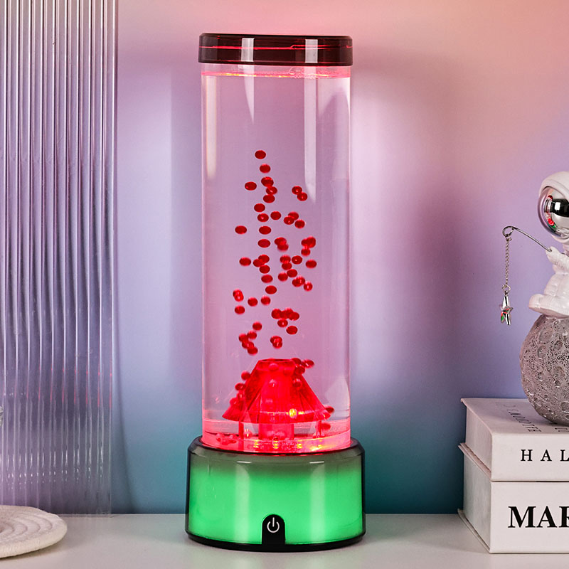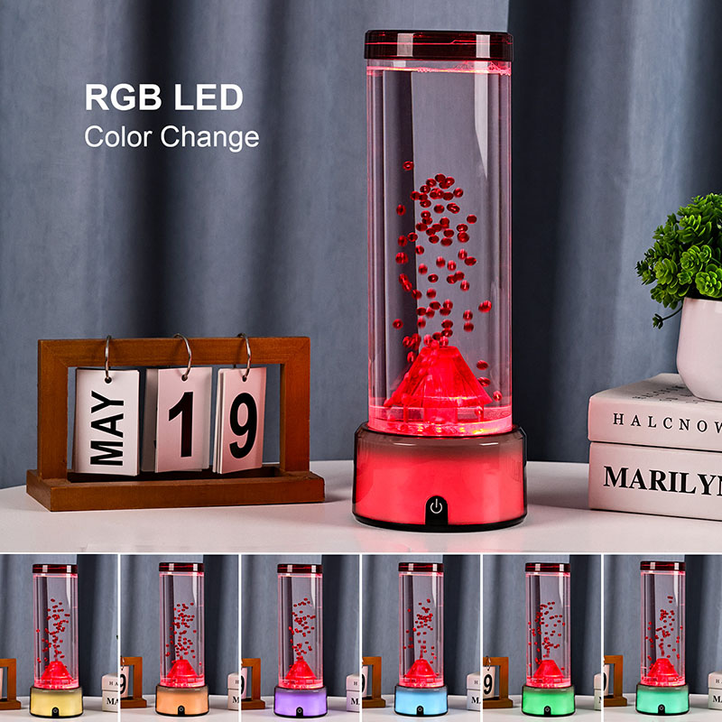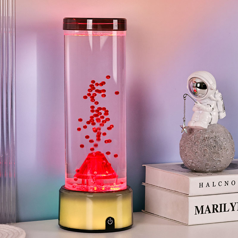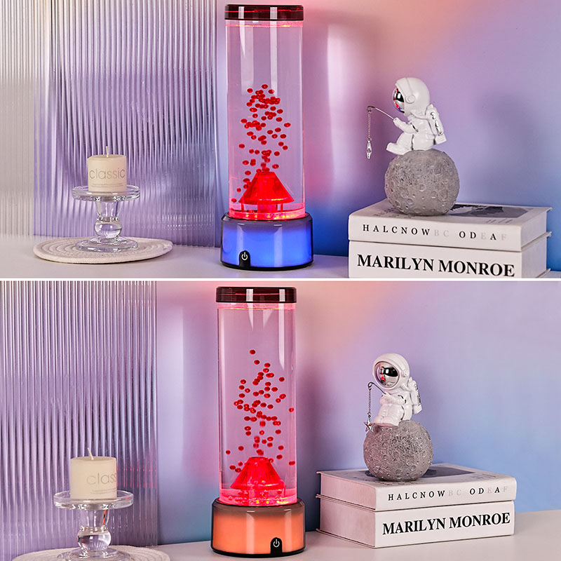 Xehetasunei arreta handiz diseinatua, sumendi-itxurako LED lanpara honek likido-ganbera zilindriko bat dauka, likido garbiz eta flotatzen diren partikula gorriz beteta, aktibatzen denean erupzio bolkanikoa simulatzen dutenak. Lanpararen oinarriak RGB argi dardaratsu eta kolorez aldatzen ditu, sumendiaren erdiko egiturak suzko argiz pultsatzen duen bitartean, benetako erupzio bat imitatuz. Aldi berean, medusa itxurako apaingarri delikatuak dotore flotatzen dira zutabe likidoaren barruan, urpeko giro surrealista gehituz. Elementu hauek elkarrekin, naturaren boterea diseinu modernoaren dotorezia eta dotorezia uztartzen dituen ikusmen-ikuskizun liluragarria sortzen dute.Diseinua eta Estetika Erakargarritasuna RGB Kolorea Aldatzeko Sumendi Lanparak gutxi gorabehera 12 hazbeteko altuera du, eta ezin hobea da mahaietan, gau-mahaian, apaletan edo egongelan, logeletan edo are gehiago, dekorazio-pieza deigarri gisa jartzeko. Bere silueta dotore eta modernoak kalitate handiko plastikozko hodi zilindriko gardena du, hausten erresistentea dena, iraunkortasuna eta segurtasuna bermatuz. Goiko estalkia modu seguruan itxita dago ihesak saihesteko, eta oinarria, berriz, akabera leun eta matez egindako plastikozko kontrol panel batekin egina dago.
