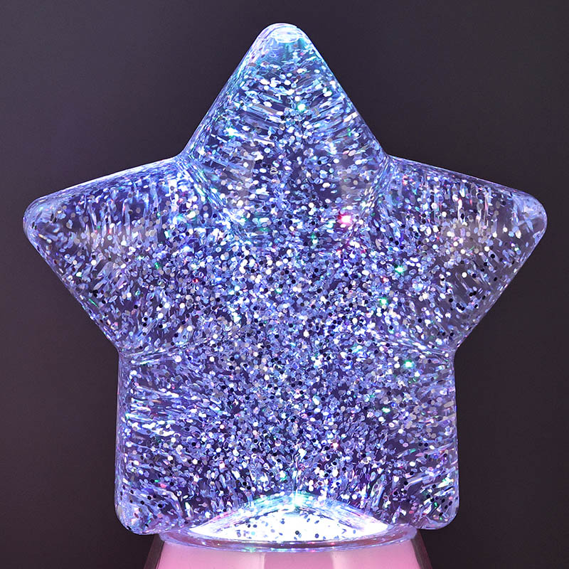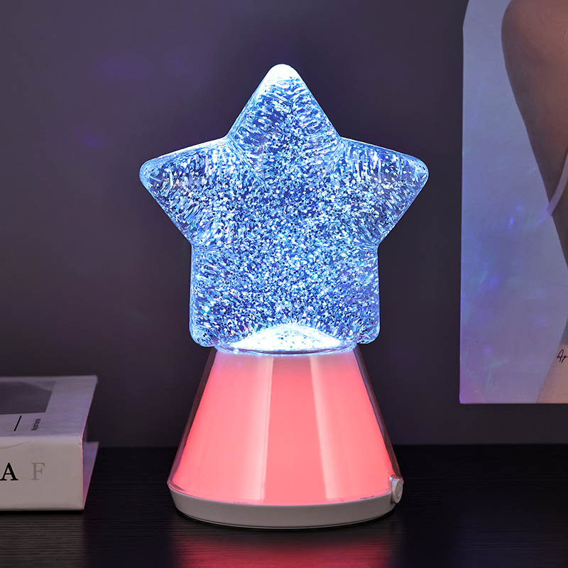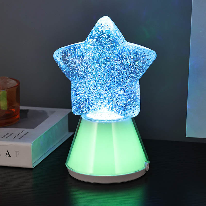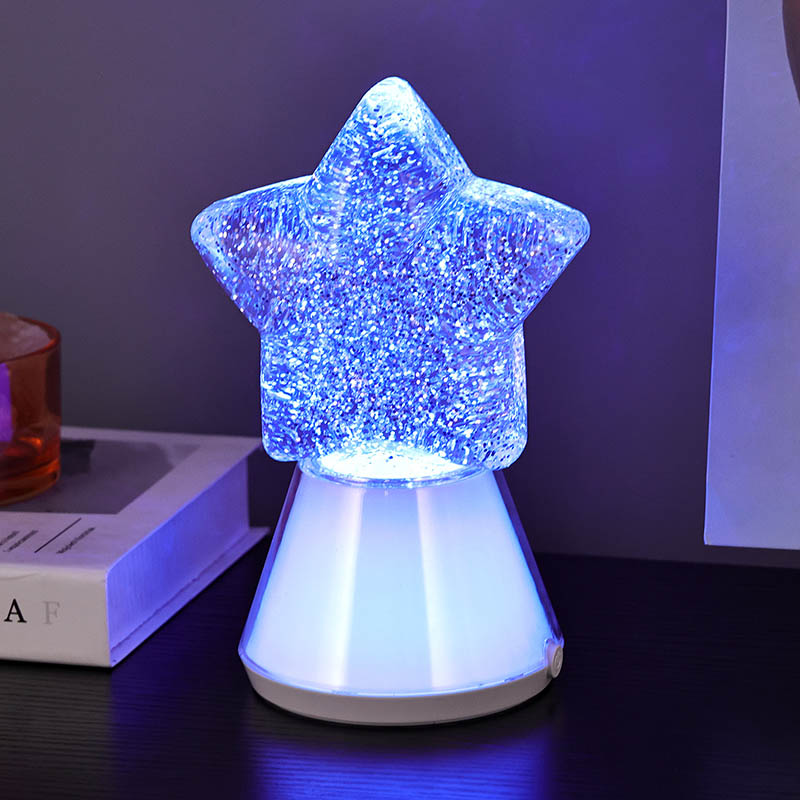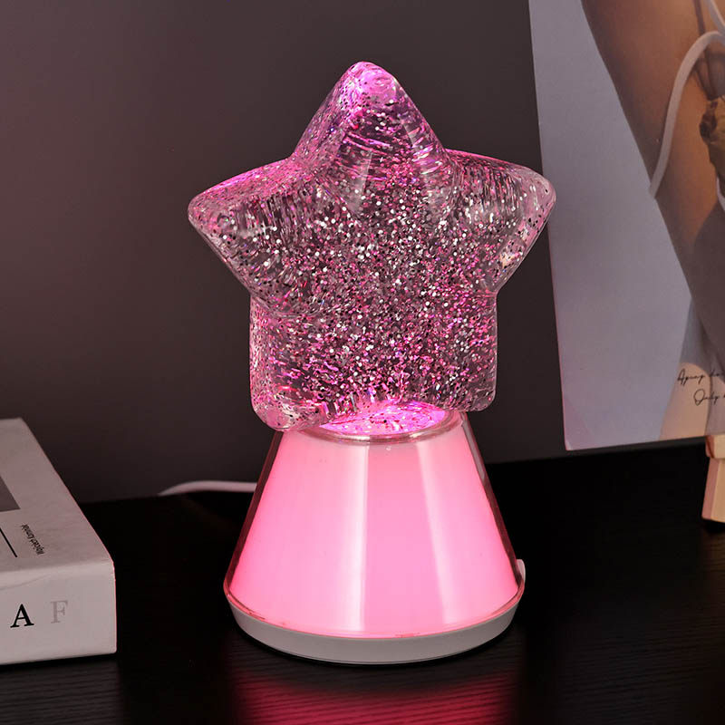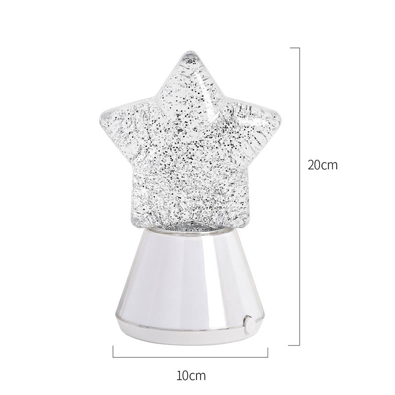 Gaueko magia gaueko dekorazioko lanpara batekin, zeruko edertasunaren funtsa harrapatzen duen izar itxurako diseinu harrigarria du. Kalitate handiko materialetatik landuta, lanpara honek plastiko gardenaz egindako oinarria du, koloreak sinkronizatzen dituena, barneko RGB LED argiekin. Izarra bera likidoan esekitako distira distiratsuz beteta dago, lanparak pizten diren heinean ikusmen efektua liluragarria sortuz. Koloreek tonu bizien espektroaren bidez ziklo gisa, distira dantzak barruan, ortografia utziko dizuten argi distiratsuen kaleidoskopioa bota zuten.